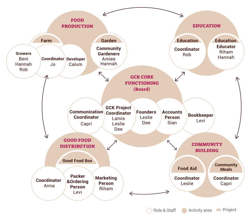This diagram is a simplification of our complex structure. In reality, at GCK we try and distribute our program delivery and core functions, with all staff contributing at all levels of the organisation. Many of our decision-making processes and financial choices are made using flat and decentralised methodologies.